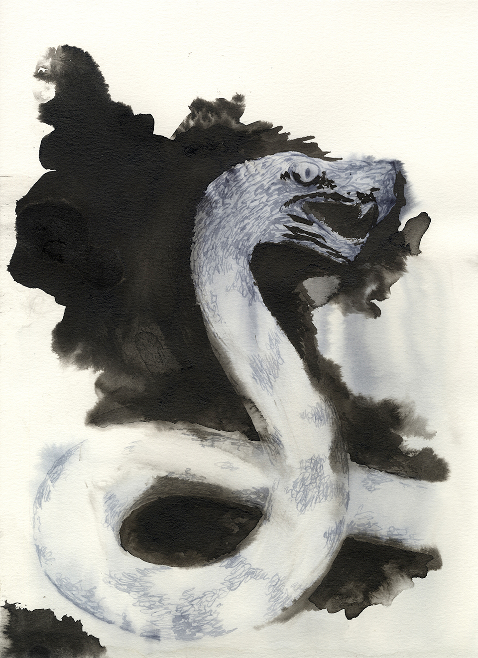 ⚫ "Cœur" (heart) and "Serpent" — Indian ink and pencil on watercolour paper washed under the shower, drawn during one of the darkest periods of my life (November 2018).