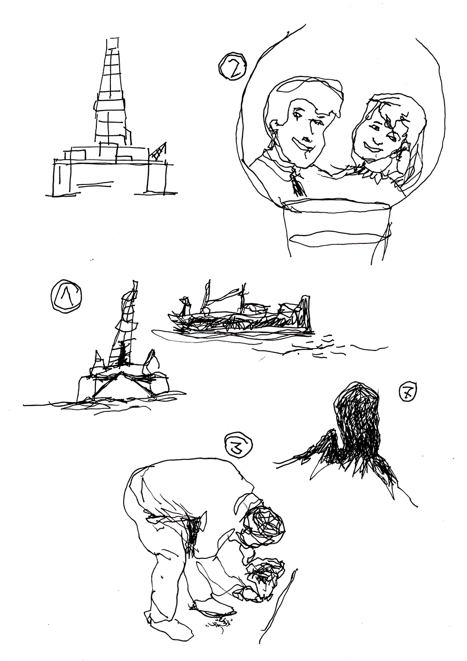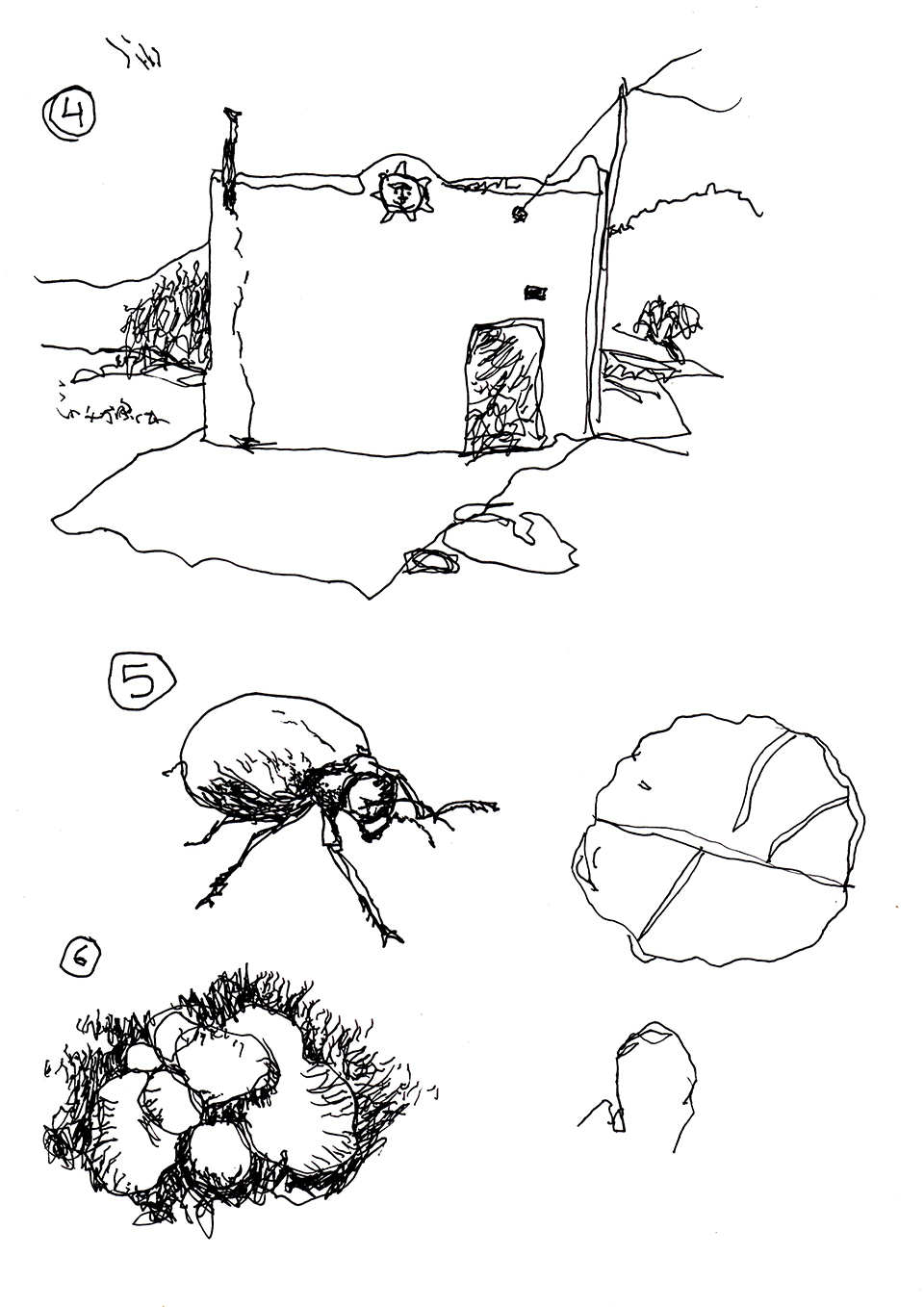 ⚫ "Diario de Viaje a Gran Canaria" — rotulador sobre papel (diciembre de 2013). 1) Plataforma petrolífera en rumbo al Golfo de Guinea. 2) Logotipo de leche MILLAC sin cambios. MILLAC es un tipo de leche líquida que está constituída a partir de leche en polvo rehidratada, mis abuelos solían beberla. El sabor es horrible pero me imagino que les recordaba un tiempo en el que la leche era mucho más escasa en Canarias y la mayoría de la gente tomaba leche en polvo. 3) Mi padre cosechando una lechuga. 4) Una casa con un sol pintado. 5) Escarabajo negro (Pimelia sp). 6) Seta de cardo (Pleurotus eryngii). 7) El Roque Nublo, por supuesto.