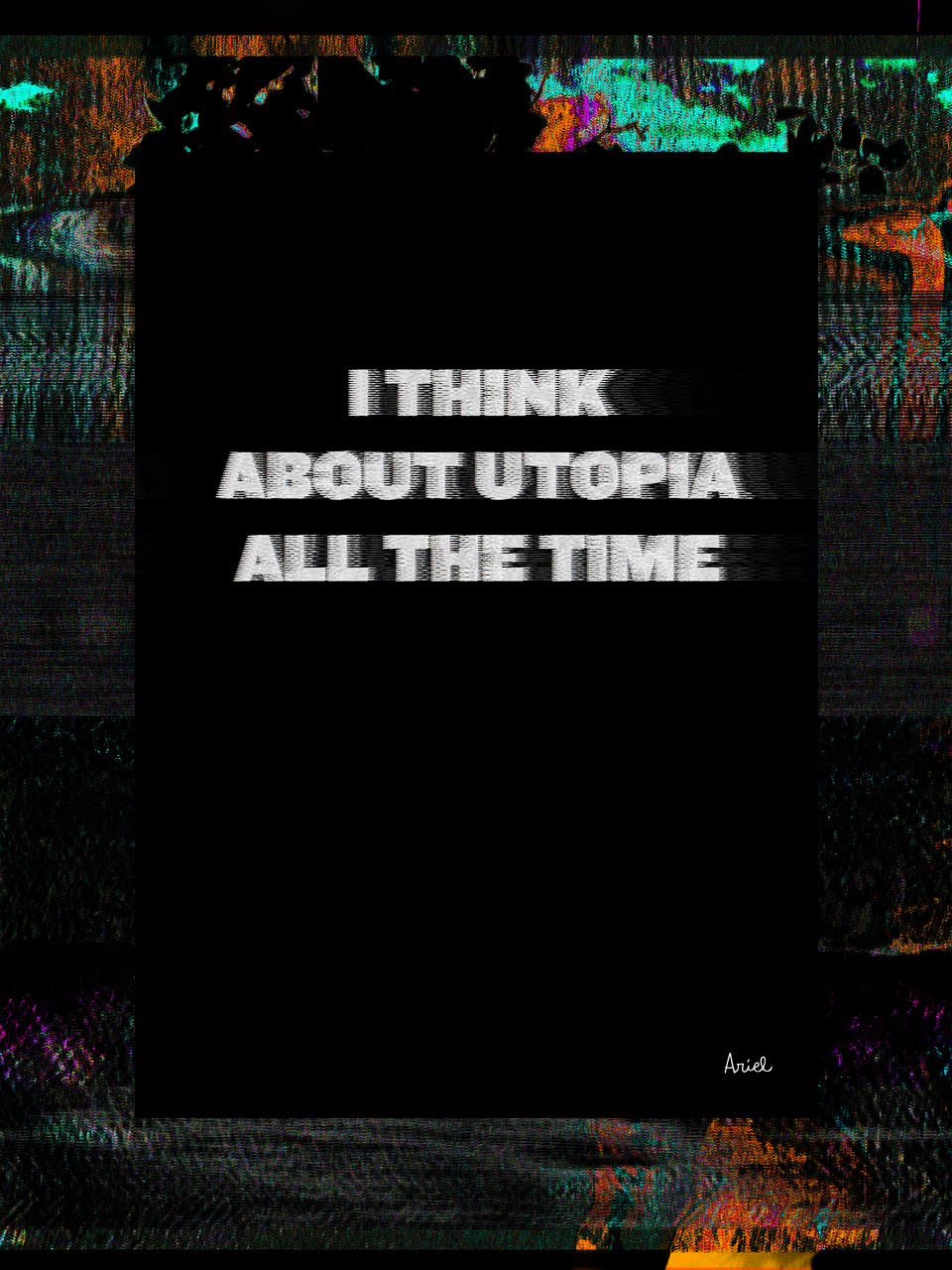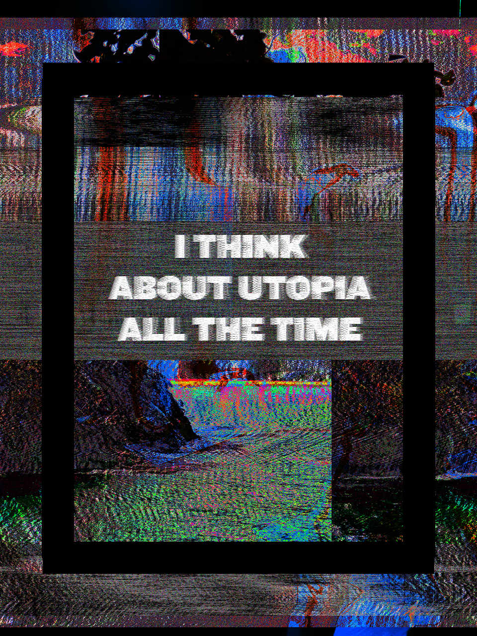⚫ "I THINK ABOUT UTOPIA ALL THE TIME" ("PIENSO EN LA UTOPÍA TODO EL TIEMPO") — carteles al estilo glitchcore, a partir de imágenes cuyos datos fueron corrompidos (febrero de 2014).
