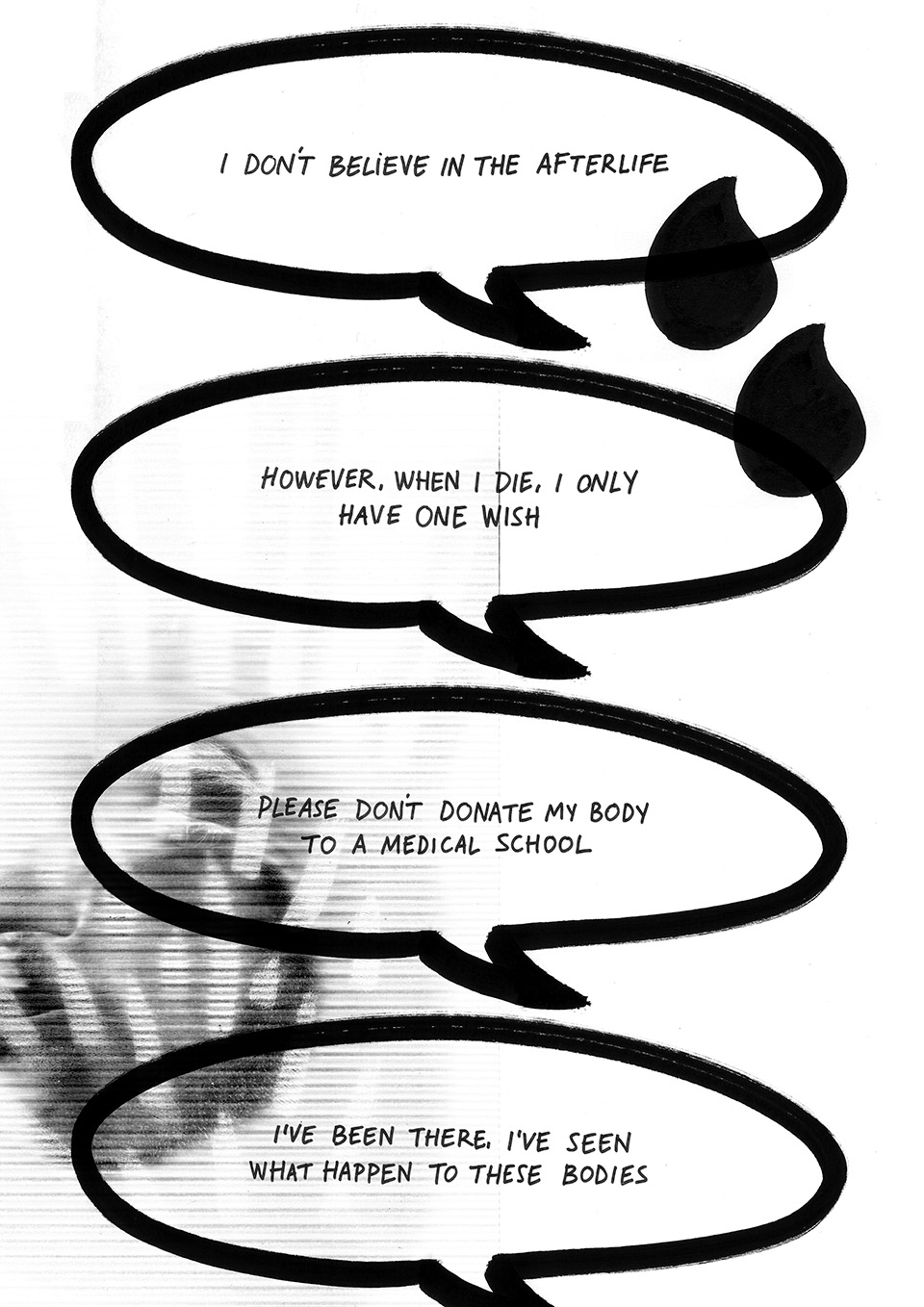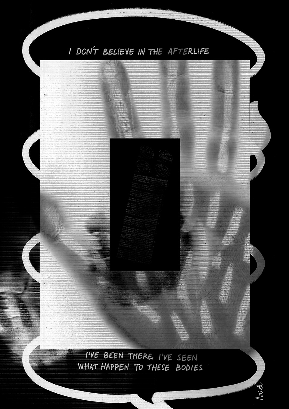 ⚫ "When I die" ("Cuando muera") — dibujos, letras, partes corporales escaneadas, basado en mis recuerdos de estudiante en biología (febrero de 2014).